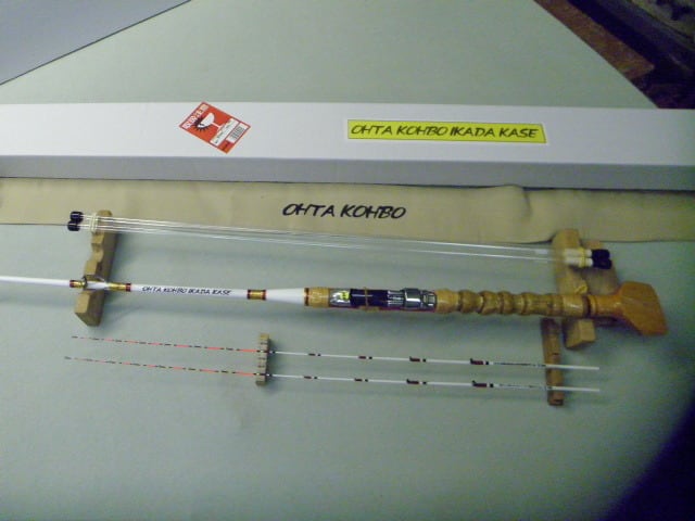 大型の肘当てを付け大物の強い引きにも楽に耐える筏竿です。